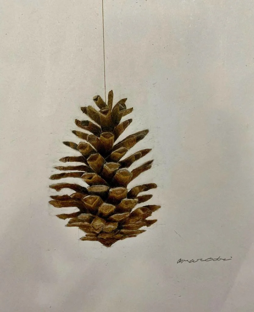 Being still inspired by nature, I started inspecting the pinecones that fell on the garden outside of my school. I have always had a fascination with pinecones. When I was little I would spend recess inspecting the garden and would try to find the biggest pinecone to bring home with me. I had a collection of the pinecones I found in my own garden. Because of this I choose to draw a pinecone. I choose to tie a piece of string around the pinecone and focused on depicting the depth in the object.